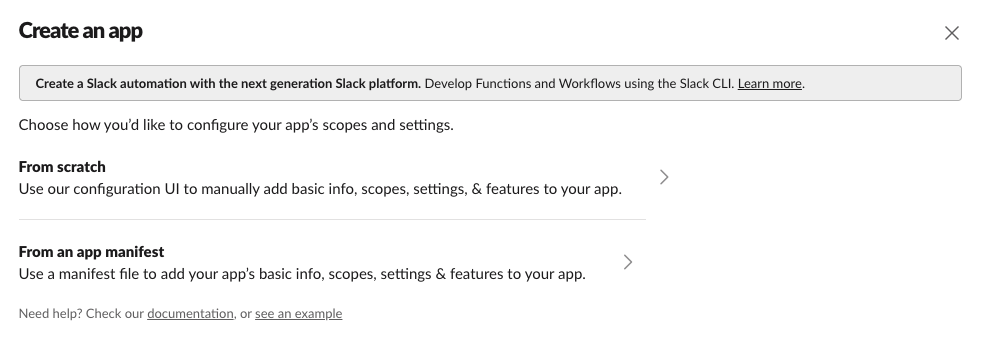 1. Select From Scratch. Enter your App Name (e.g. Airbyte Sync Notifications) and pick your desired Slack workspace.